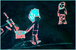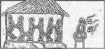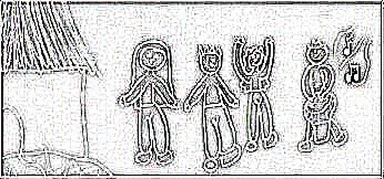 Toen hij zich omringd had met deze figuren, was zijn eenzaamheid nog altijd niet verdwenen. Want het waren slechts beelden, geen echte mensen die konden praten. Toen pakte hij zijn trommel en begon muziek te spelen. |