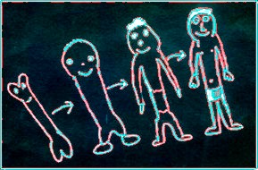 En zie, de beelden kwamen tot leven. Hun elleboog en knieën die nog aan elkaar vast zaten, kwamen los. Ze begonnen te dansen. Zo zijn de eerste mensen ontstaan. |